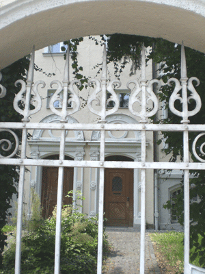 Eingangtüren der Doppelvilla durch das schmiedeeiserne Gartengitter im Torbogen von Haus N r. 41 gesehen