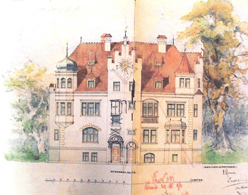 Doppelvilla Kerschensteiner / Plaß zur Straßenseite hin, aquarelliert, Leonhard Romeis 1896. Buchscan aus: Sixt, Der Architekt Romeis, s.o.