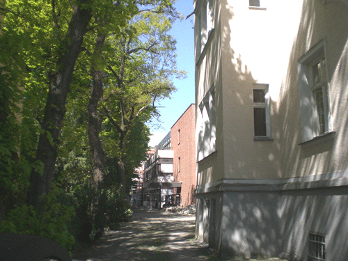 Blick auf den zinnenbestückten Vorbau an der Südseite der Kerschensteiner Villa, an dem vorbei es in den Gartenbereich führt. Im Hintergrund der moderne Erweiterungsbau (Schule) des Schmitthenner-Gebäudes, frühere »Beamten-Relictenanstalt«, Maria-Theresia-Straße 35. © dietlind pedarnig (2007)
