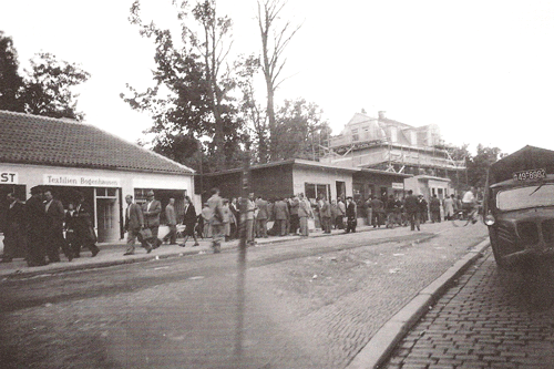Der Andrang zum Schwarzmarkt in der Möhlstraße war außergewöhnlich groß. Es gab vier Speiselokale für müde und hungrige Passanten. Hinter den Behelfsläden an der Gabelung Möhl-/ Weberstraße finden gerade Aufbauarbeiten an der kriegsgeschädigten Villa Oberkamp statt. Quelle: Buchscan aus: s.o.