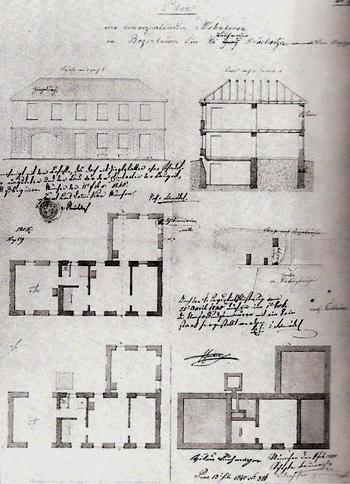 Plan aus dem Jahr 1840 zur Errichtung eines Wohnhauses an Stelle des "Streicher-Hofes": Quelle: Buchscan aus: s.o.