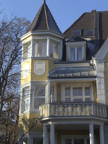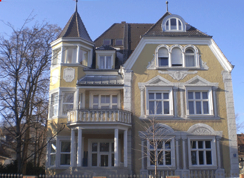 Eine besonders "spektakuläre" Villa errichtete Anton Bachmann 1906 bis 1909 für den damaligen Grundstücksbesitzer der Möhlstraße 9, den Verleger Max Hirmer. Die gesamte Fassade ist in "trompe d’oil"-Manier mit illusionistischer Wandmalerei im Stil der "Deutschen Renaissance" ausgeschmückt. Die allein für den Grundstückserwerb aufzubringende stattliche Summe von 70.000 Goldmark steht für die finanzielle Leistungsfähigkeit des Bauherrn, die typisch ist für die Villenbesitzer in diesem Quartier zu Beginn des 20. Jahrhunderts. Hirmer hatte sich zunächst nach seinem Zuzug von Straubing nach München 1904 die Villa in der Möhlstraße 41 gekauft, diese aber, wohl weil sie ihm nicht repräsentabel genug war, wieder veräußert. Das Geld von diesem Verkauf steckte er dann in den Neubau an der Möhlstraße 9. Ende Dezember 1906 zog Hirmer bereits mit seiner Familie in das neue Prunkstück ein, aber noch 1908 konnten sie nur den ersten Stock des Gebäudes bewohnen, da es immer noch nicht fertig gestellt war. Hirmer beklagte den "ganz unglücklichen und ungeschickten Grundriss" seiner Wohnung, die zwar sehr große, aber leider zu wenige Räume aufwies. So sei er, da er keine Garderobe habe, gezwungen, die Kleiderschränke in der Dienstbotenkammer unterzubringen!