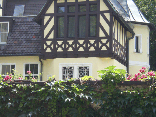 oben: Die renovierte »Trinkstube« der Wulffen-»Villa«, im Fachwerkstil, von der Neuberghauser Straße aus gesehen. © dietlind pedarnig (2007)