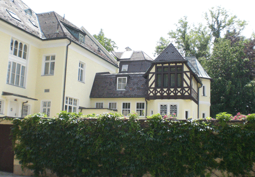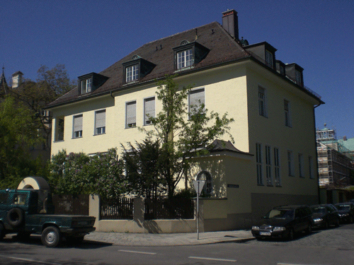Ost-Nordansicht der Wulffen/Schuster-»Villa« an der Ecke Möhl- / Neuberghauser Straße im Jahr 2008. Links spitzt noch das Fachwerk der Villa Plaß durch die Bäume, rechts zu sehen das zur Totalrenovierung eingerüstete Schmitthenner-Haus, Maria-Theresia-Straße 35. © dietlind pedarnig