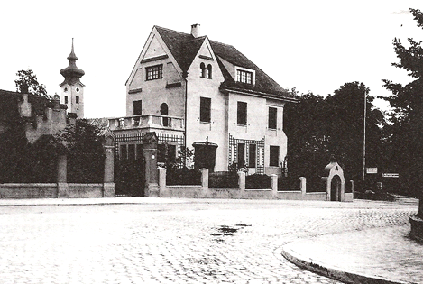 Ostansicht des Atelierhauses von Karl von Wulffen (links) und der Villa Schuster, Möhlstraße 45, um 1910. Die Straßenpflasterung - ein altes "Katzenkopf"-Straßenpflaster, stammt aus dem Jahr 1876. Im Hintergrund zu sehen der Turm von St. Georg. Quelle: Buchscan aus: Karl, Möhlstraße, 1998.