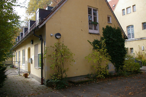 Zum Anwesen des Bernheimer Schlösschens, Muspillistraße 19, zugehöriges Gebäude. Es war die ehemalige Autogarage und Chauffeurs-Wohnung.