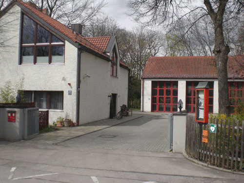 Foto: Dienstgebäude mit Wohnung (links) und Fahrzeughalle (hinten) der Freiwilligen Feuerwehr Oberföhring; © dietlind pedarnig, 2008