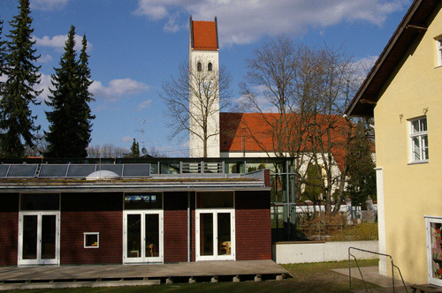 unten: Kindergartenneubau, Muspillistraße 11, rechts der ehemalige "Bichlbauerhof"; hpt © Verein für Stadtteilkultur im Münchner Nordosten e.V.