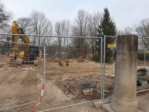 Baustelle Oberföhringer Straße 35; im Vordergrund einer der beiden historischen Kilometersteine des Bezirks