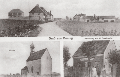 unten: Postkarte aus "Dening" um 1930 mit der Schutzengelkapelle St. Georg (links unten) und der "Handlung" von Maria Forstmeier, dem ersten Geschäft in Denning (rechts unten). Oben quer ist eine Gesamtansicht von Denning; Scan aus: "Dörfer auf dem Ziegelland", hrsg. von Willibald Karl, München 2002.