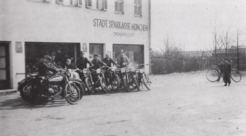 Mitte: Motorräder vom Mächtlinger, abgestellt vor der Zweigfiliale 21 der Städtischen Sparkasse, Ostpreußenstraße 22, 1938 © Verein für Stadtteilkultur im Münchner Nordosten e.V.