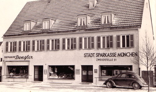 Textil- und Eisenwaren Dengler, Ostpreußenstraße 24 (Stand 2014 Rocco’s Salumeria & Snack Bar, Ostpreußenstraße 26, davor Quellenapotheke) und die Zweigstelle 21 der Städtischen Sparkasse München, Ostpreußenstraße 22 (heute Dimitrios Vassiliadis Pilshütt'n, Ostpreußenstraße 26) in den 1930er-Jahren. An den langgezogenen, Bau wurde in den 1960er-Jahren angebaut, sodass sich heute direkt Hausnummer 24 (Stand 2014 Textilreinigung) und Hausnummer 22 (Stand 2014 Vinzenz-Murr-Filiale) anschließen. (Siehe Luftbild unten)