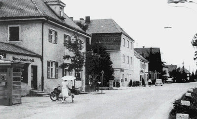 Foto mit Mouse-OverEffekt (Bitte mit der Mouse über das Bild fahren): Die Ostpreußenstraße in den 1950er-Jahren. Nach der Einmündung der Dirschauer Straße (Bildmitte) ist das ehemalige Postamt Denning, Ostpreußenstraße 31, zu sehen. Dieselbe Stelle 2008: Im Vordergrund der Neubau mit der Stadtsparkasse, nach der Einmündung Dirschauer Straße das renovierte Gebäude des ehemaligen Postamts, heute Wohnhaus mit Geschäften im Erdgeschoss. Genau gegenüber lag ehemals das "Gasthaus zur Post". Historische Fotoquelle: "Dörfer auf dem Ziegelland", hrsg. von Willibald Karl, München 2002; Farbfoto 2008: © dietlind pedarnig