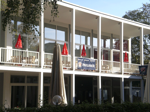 Die 1957 nach den Plänen des Architekten Franz Ruf erbaute Gaststätte ist Teil des Ensembles der Parkstadt Bogenhausen und schließt sich direkt an das sogenannte "Große Ladenzentrum" (Buschingstraße2-4) des gleichen Architekten an. Eigentümer des Anwesens war die Paulaner Brauerei. Das Gebäude ist mit seinem niedrigem Seitenflügel stumpfwinklig zur Ladenzeile angeordnet, das höhere Obergeschoss ist raumhoch verglast, mit einem an den Frontseiten stark vorkragendem Dach und weit ausgreifenden Arkaden. Lage in der Parkstadt: