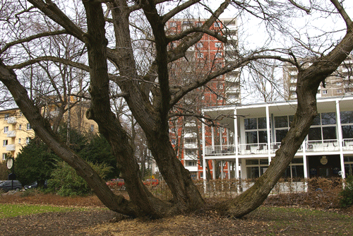 Die Parkgaststätte im Jahr 2007, dahinter die Hochhäuser Buschingstraße 45 und 43; dietlind pedarnig.
