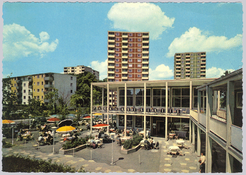 Großes Ladenzentrum (im Vordergrund) und Parkgaststätte mit Bogentreppe