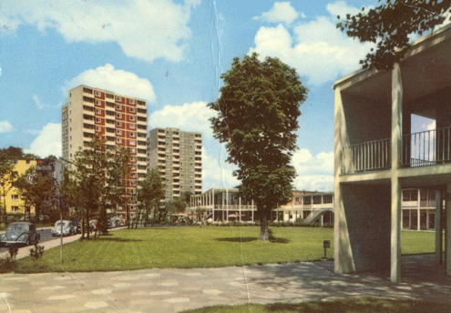 Parkgaststätte und Hochhäuser Buschingstraße, Postkarte, Ende 1950er Jahre.
