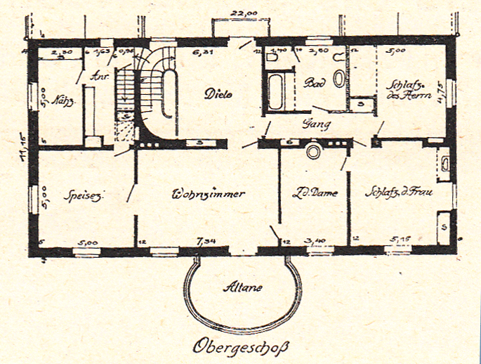 Grundrisslich interessant ist die schmale Verbindung vom Treppenpodest, wenige Stufen tiefer zu der Anrichte und dem Nähzimmer neben dem Speisezimmer. Ein einfarbiger roter Vorhang schließt sie gegen die Diele ab. Ein kurzer Gang führt von dieser zu den Schlafräumen und dem Bad. Zwischen das Schlafzimmer der Hausfrau und das im Mittelpunkt des Hauses liegende allgemeine Wohnzimmer schiebt sich noch das kleine, intime blaue Zimmer der Dame. Vor einer tiefen Nische steht in der Mitte der Schmalseite eine Empirekachelofen für die Übergangszeit. Die Möbel sind in Kirschbaum. Das Abschließen des Damenzimmers drückt sich gut in dem Versetzen seiner beiden Türen aus. Das stattliche Wohnzimmer (Grundfl. 7,34 x 5 m) mit seinen Mahagonimöbeln, der schwarz-grünen Stoffbespannung der Wände und dem schweren, grauen Teppich ist der reichste Raum des Hauses. Er ist der Sammelpunkt des häuslichen Lebens, dient den Besitzern als einziger Wohnraum und gleichzeitig größerer Geselligkeit. Das Speisezimmer von 25 qm Grundfläche erscheint daneben fast klein, es ist feierlich auf weiß, schwarz und blau gestimmt. Ein grauer Teppich stellt die farbige Verbindung mit dem beherrschenden Wohnzimmer daneben her. Von diesem öffnet sich eine geräumige Altane nach Süden. Wohntechnisch ist es vielleicht ein Nachteil, daß sie ungedeckt ist und deshalb Tisch und Stühle jedesmal durch das vornehme Wohnzimmer herein- und hinausgetragen werden müssen.