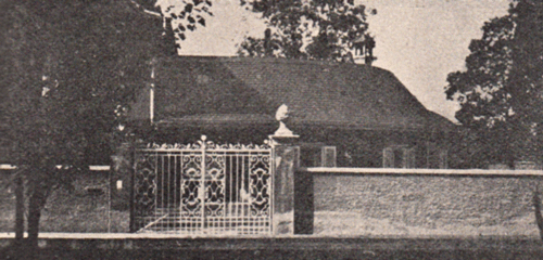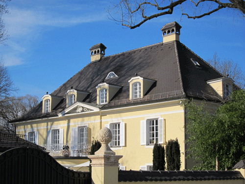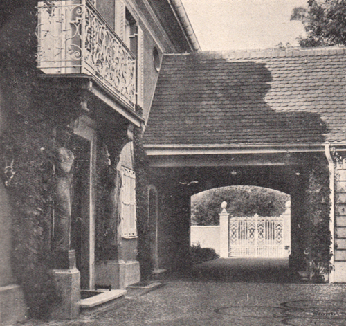 Dem Äußeren kommt es sehr zugute, daß im Erdgeschoß nur untergeordnete Räume stecken und so die großen Fenster des Wohngeschosses in vier Meter weiter Achsenstellung die Fassade beherrschen können. Das dunkel ruhige Dach und die symmetrisch herauskommenden Kamine unterstreichen noch die einfache große Linienführung. Ihr ordnet sich der niedrige Giebel des flachen MIttelrisalits unter, er schließt nur die Altane nach oben ab. Weiß steht alles Holzwerk und Eisen vor der gelben Fassade. Die Fenster, die Klappläden, die Korbgitter der Erdgeschoßfenster und die lustige, geschmiedete Rokokobrüstung des Vorbaus. Die weite vertiefte Rasenfläche vor dem Haus steigert die Wirkung der Fassade noch weiter.«