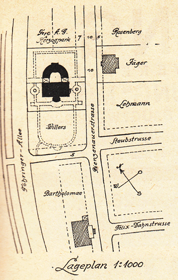 »Die Lage des Hauses ist denkbar günstig. Zwischen der Isar und der wenig befahrenen Pienzenauerstraße liegt es, im Grün versteckt, auf einem schönen großen Grundstück im Herzogpark. Die nördliche Hälfte nimmt das Haus mit dem Wirtschaftsanbau ein. Ihm im Süden vorgelagert ist der große Garten. Von der Altane vor dem Wohnzimmer im ersten Stock sieht der Besitzer in weitem Umkreis über ihn hinaus nur Bäume und Wasser. [...] Um Hauptbau und Wirtschaftsanlagen zu einem Ganzen zusammenzuschließen wurden diese halbkreisförmig gebogen und an die Nordseite des Wohnhauses angebaut. An der überdeckten Durchfahrt zwischen beiden liegen sehr praktisch angeordnet alle Zugänge: Der zur Wohnung, zum Büro, zur Küche, zur Hausmeisterwohnung, Garage und Waschküche. [...] In der überdeckten Durchfahrt zwischen beiden liegen sehr praktisch angeordnet alle Zugänge: Der zur Wohnung, zum Büro, zur Küche, zur Hausmeisterwohnung, Garage und Waschküche.
