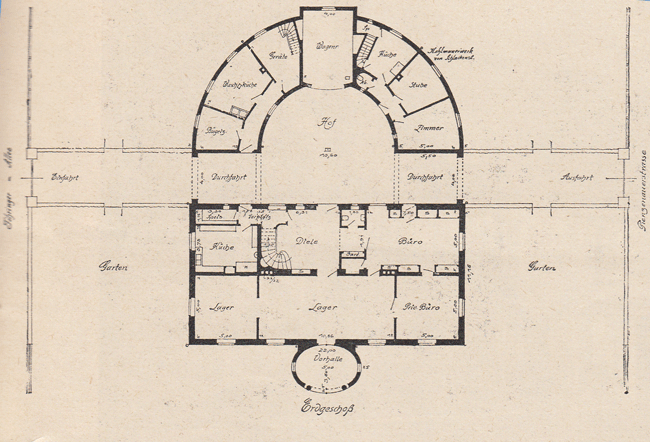 Das Erdgeschoss nimmt die Räume für die geschäftliche Tätigkeit des Besitzers - Büros und Lager - [für das Stoff-Exportgeschäft Willers] und außerdem die Küche auf. Die Lagerräume für die Stoffe verlangen die ihnen gegebenen hohen, hellen Räume, da sie gleichzeitig dem Verkehr mit den Käufern dienen und diese sich hier ihre Stoffe heraussuchen. Unter der gedeckten Vorhalle können sie sich bei jeder Witterung die Stoffe im Freien betrachten. Die Diele im Erdgeschoss, durch eine kleine Kleiderablage von dem Büroeingang getrennt, gehört schon zur Wohnung und ist deshalb anspruchsvoller ausgestattet. Verschiedenfarbige Marmorfliesen, ein weißer Anstrich von Wand und Decke, bis um Boden verglaste und versproßte Nußbaumtüren und sie sich im Halbkreis hinaufschwingende Treppe geben ihr das Gepräge. Eine hübsche, figürliche Stuckarbeit von Prof. Friedrich Lommel, 2 spinnende und webende Frauen, erinnert an die Tätigkeit des Besitzers. Folgender hübscher Spruch ziert sie: ›Arbeit ist die edle Schmiede und Mut der starke Schmied und Not, der Knecht, der Nimmermüde, der die sturmgefüllten Bälge zieht.‹