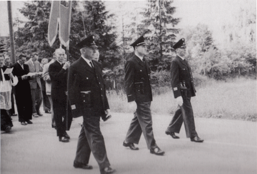 Polizeibeamten führen eine Fronleichnamsprozession in der Ostpreußenstraße an (um 1960) © Verein für Stadtteilkultur im Münchner Nordosten e.V.