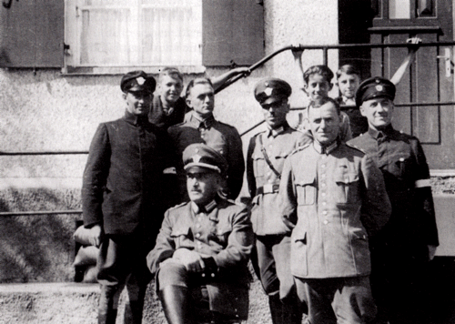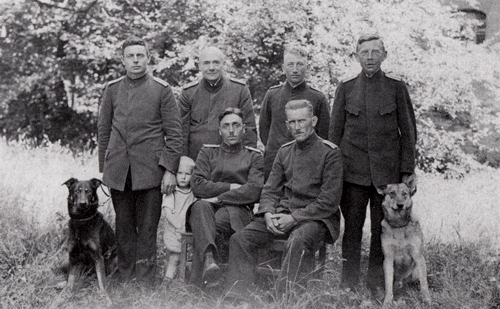 Polizeibeamte in Denning mit Revierführer Müller (sitzend), stellvertretendem Revierführer Ohneberg (Mitte stehend mit Mütze) in der Uniform der Reichspolizei; außen zwei Angehörige der Hilfspolizei, 1939. © Verein für Stadtteilkultur im Münchner Nordosten e.V.