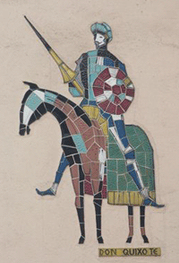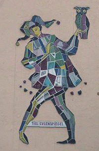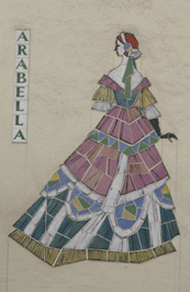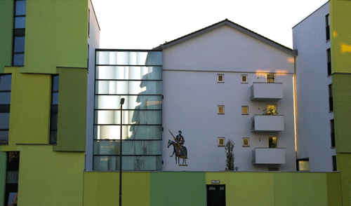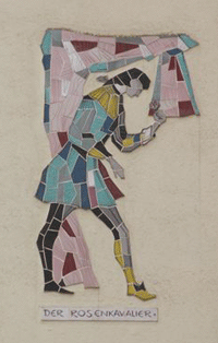 MItte: Mosaiken von Figuren aus Opern von Richard Strauss an den Fassaden der Reihenhäuser in der Richard-Strauss-Straße im Abschnitt zwischen Denninger Straße und Effnerplatz. Im Rahmen der Untertunnelung entstehen hier neue Wohneinheiten als Lärmschutzmaßnahmen, daher wurde den bestehenden Reihenhäusern 2007 die Adresse "Amberger Straße" neu zugewiesen. Die Mosaiken können der Künstlerin Mecke-Steger zugeordnet werden – sie blieben bei den Baumaßnahmen erhalten. Datierung unbekannt. hpt © Verein für Stadtteilkultur im Münchner Nordosten e.V. (2008)