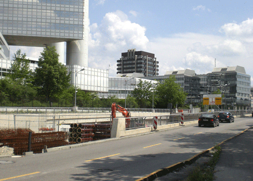 oben: Richard-Strauss-Straße in Höhe Hypo-Hochhaus während der Baumaßnahmen zur Untertunnelung des Mittleren Rings; © dietlind pedarnig (2007)