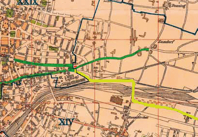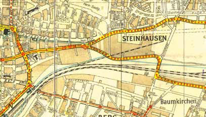 Die alte Verbindungsstraße von Haidhausen in Richtung Osten (früher Äußere Wiener Straße, heute Einsteinstraße) gabelte sich kurz nach der Grenze von Steinhausen in zwei Verbindungen zu den östlichen Nachbargemeinden: die Truderinger Straße (benannt 1913) führte, wie schon der Name sagt, nach Trudering (gelbe Markierung) und die nördlichere, die Zamdorfer Straße, nach Zamdorf (grüne Markierung). Letztere wurde 1937 in Riemer Straße umbenannt, weil sie als neue Verbindungsstraße von der Stadt zum geplanten Münchner Flughafen in Riem gedacht war.