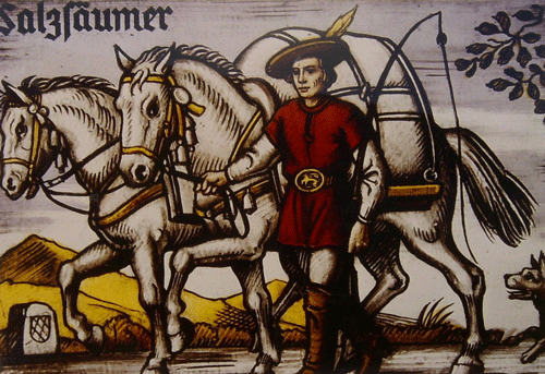 unten: mittelalterlicher Salzhändler mit seiner Ware