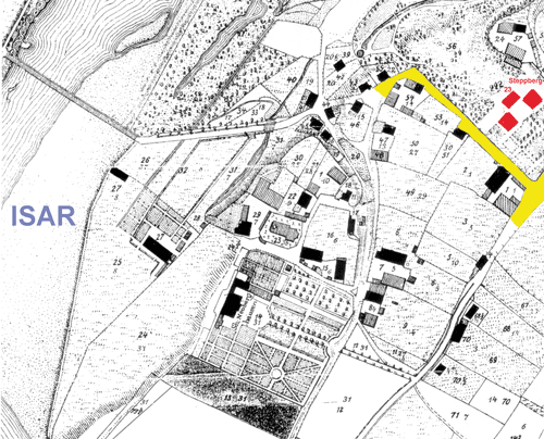 Urkatasterplan von 1812: rot markiert: die Gebäudeteile des Schlosses Steppberg im Besitz von Montgelas (Hausnummer 23); gelb markiert: Törringstraße (westlich parallel zum Grundstück verlaufend) mit den Einmündungen in die Montgelasstraße (nördlich) und Ismaninger Stra0e (südlich).