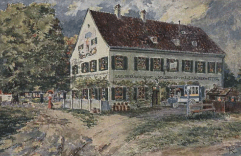 unten: Mouse-over Effekt (bitte mit der Mouse über das BIld fahren): Kunstpostkarte der Schlosswirtschaft, um 1920 (?). In der rechten unteren Ecke die Signatur "R." Es zeigt das Gasthaus um 1910, denn die gemalte Aufschrift am Gebäude lautet: »Gast und Tafernwirtschaft - Schlosswirt - von J. und E. Kronenwetter«. Die Gastwirtseheleute Johann und Elisabeth Kronenwetter, geb. Mader, hatten 1910 die Wirtschaft als Miteigentümer zur Hälfte erworben. 1912 verkauften sie ihren Anteil bereits wieder an die Bräumeisterswitwe Anna Heckl aus St. Veit bei Neumarkt. Vor der Wirtschaft ist ein Personenbus der damaligen »"Kraftpost« zu sehen. Neben dem Personentransport hatten diese Busse Briefkästen an Bord, in die Post eingeworfen werden konnte. Nach einer kriegsbedingten Stagnation in der Entwicklung erfuhr die "Kraftpost" ihre erste Blüte in den 1920er und frühen 1930er Jahren, als mit Kraftpostlinien der ländliche Raum erschlossen wurde. Hierbei gab es ein starkes Nord-Süd-Gefälle, da im norddeutschen Flachland bereits ein dichtes Netz an Eisenbahnlinien bestand, wohingegen in Süddeutschland Kraftpostbusse in vielen ländlichen Gemeinden die erste Anbindung an größere Verkehrswege darstellten. Das Gebäude der ehemaligen "Bräupfanne" im Jahr 2008 hpt © Verein für Stadtteilkultur im Münchner Nordosten e.V. Immerhin gibt es noch das Buswartehäuschen und erinnert so an die ehemalige Posthaltestelle ...