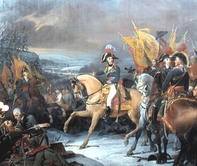 Mitte: Historiengemälde der Schlacht von Hohenlinden am 3.12.1800. In der Mitte General Moreau, begleitet von den Generälen Grouchy und Ney, im Hintergrund österreichische Gefangene.