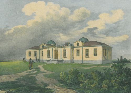 Carl August Lebschée: »Das astronomische Gebäude«, Lithografie aus »Malerische Topographie des Königreiches Bayern«, 1830. Der etwas vorspringende mittlere Teil, der Meridiansaal, beherbergte drei Passageinstrumente. In der östlichen Kuppel (re.) befand sich das Äquatorial, die westliche (li.) diente der Aufstellung transportabler Instrumente.