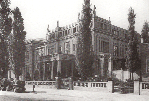 Stuck-Villa um 1930. Noch steht die Bronzefigur der »Reitenden Amazone« nicht vor dem Eingangsportal ... Quelle: Buchscan aus: Willibald Karl (Hrsg.): "Bogenhausen. Vom bäuerlichen Pfarrdorf zum noblen Stadtteil", München 1992.