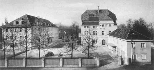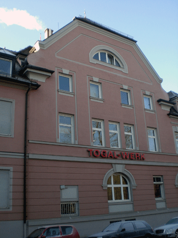 Blick von der Ismaninger Straße auf das Gebäude von Togal. Im Hintergrund das Gebäude der ehemaligen Betz'schen Gastwirtschaft, links der Erweiterungsbau von 1950 © Togal-Werk