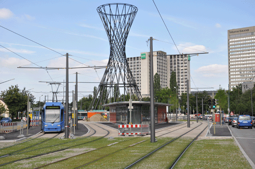 oben: Der beinahe fertig gestellte Effnerplatz mit neuer Trambahnlinienführung Linie 16 und "Mae West" (Dezember 2011); im Hintergrund das "Sternhaus" der BayWa, rechts das Sheratonhotel. © SWM / MVG