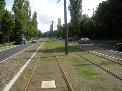 Über die gesamte Länge fahren die Züge auf einem Rasengleis im Mittelstreifen der Straße; so ist die Tram zu 100 Prozent vom Individualverkehr baulich abgegrenzt und in Verbindung mit einer Priorisierung des öffentlichen Verkehrs an den Knotenpunkten überall beschleunigt unterwegs.