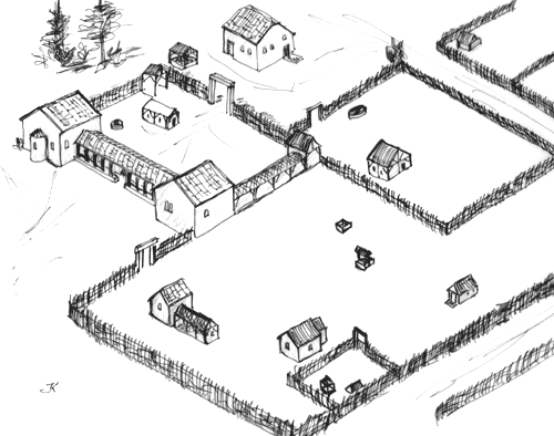 Rekonstruktionszeichnung der Denninger Römeranlage von Josef Krause (2008). Links außen das Badegebäude mit der vorspringenden Apsis.