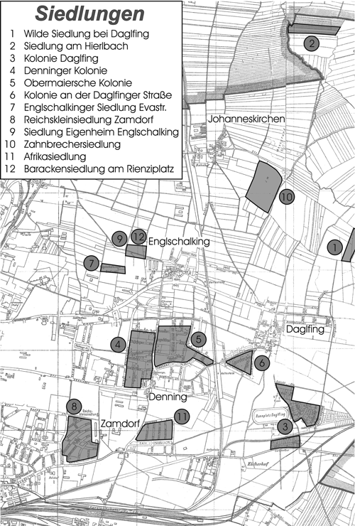 Abbildung unten: Siedlungen im Münchner Nordosten in den 1930er-Jahren © Thomas Bernst, verein für Stadtteilkultur im Münchner Nordosten e.V.