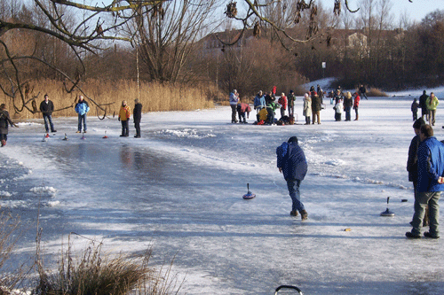 unten: Eisstockschießen am zugefrorenen Weiher des Zamilaparks, Nähe Fritz-Lutz-Straße. hpt © Verein für Stadtteilkultur im Münchner Nordosten e.V., 2009.