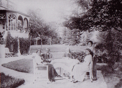 Im Garten der Villa von Ziegeleibesitzer Anton Baur, ehemals Johanneskirchner Straße 147, um 1910 © Familie Bernst. Die Villa mit dem markanten Turm wurde 1901 erbaut und um 1970 abgerissen. Zum Anwesen gehörte neben dem stattlichen Wohnhaus auch eine Almhütte und ein Springbrunnen im Garten.
