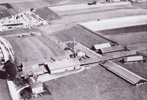Ziegelei der Familie Baur in Johanneskirchen. Links der weiße Weg entspricht dem Verlauf der heutige Musenbergstraße. Luftbild © Familie Bernst
