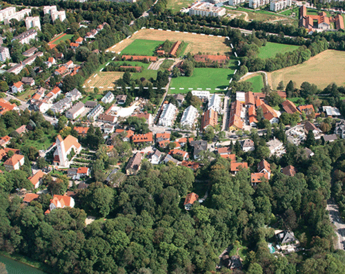 Gelände der ehemalige Ziegelei Josef Haid vor der Bebauung (gestrichelt), Bavaria Luftbild