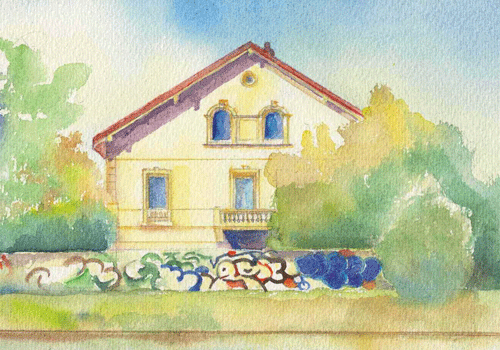 Text und Aquarell oben (Ellwangerhof) aus: Karin Bernst, Ein Spaziergang durch den Münchner Nordosten, Kalender 2012, München 2012.