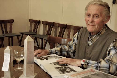 Martin Hierl besucht das »FÖHRING HAUS 1« am 10. Juli 2020. Vor ihm ein Modell des Obelisken, den er für seine Heimatstadt Dietfurt geschaffen hat. hpt©Verein für Stadtteilkultur im Münchner Nordosten e.V.