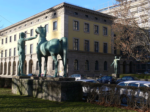 München, Arcisstraße, vorne links: »Rosselenker« von Hermann Hahn (vor der Alten Pinakothek), hinten rechts »Rossebändiger« von Bernhard Bleeker (als Einzelfigur ohne Pferd) vor der Technischen Universität, Januar 2009 © Andreas Praefcke