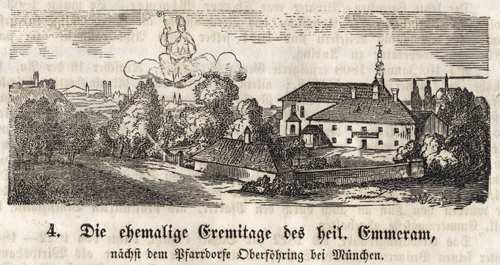 Holzstich "Die ehemalige Eremitage des heil. Emmeram" von Link, 1863, 4,5 x 10,5 cm. Links im Hintergrund ist der Isarhang mit der Pfarrkirche St. Lorenz zu sehen, dahinter die Türme der Stadt München, darüber schwebt der Heilige Emmeram. Im Vordergrund die St. Emmeram geweihte Kapelle, davor die Eremitage, das Wohn- und Schulhaus der Eremiten, die die äußerst populäre Wallfahrtsstätte betreuten.
