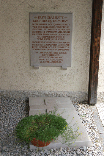 Zur Erinnerung an diese erste Grablegung des Heiligen Emmeram ließen die Aschheimer eine Gedächtnisplatte errichten. "Hier ist begraben gewesen der heilig Bischof Sant Heimran 40 tag und 40 nacht." Als Sterbedatum wird der 22. September 652 angegeben.